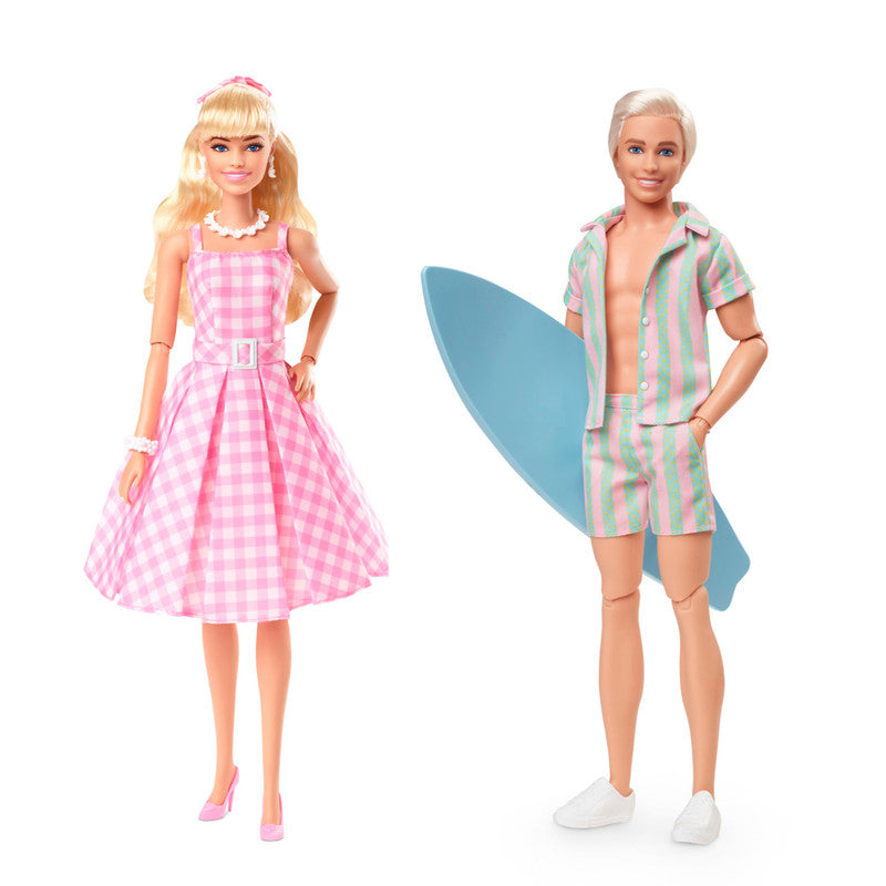 This Barbie doll wears a vintage-inspired gingham dress for her best day ever. Modelled after one of her character’s iconic looks in Barbie The Movie, the doll is accessorized with a matching belt, pastel pumps, daisy necklace, and daisy drop earrings. The Ken doll is ready to catch some waves. With a surfboard in tow, Ken wears a beachy, striped matching set. Celebrating Barbie The Movie, this Ken doll makes a great gift for fans and collectors alike.