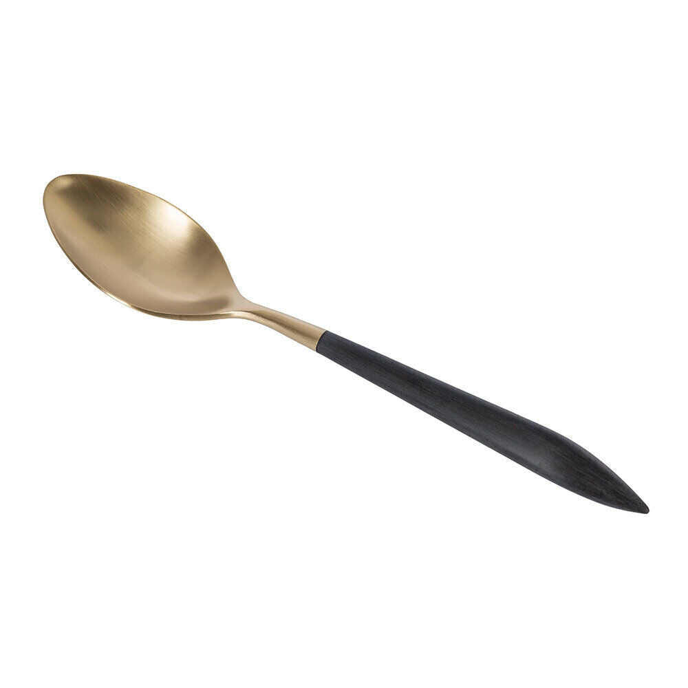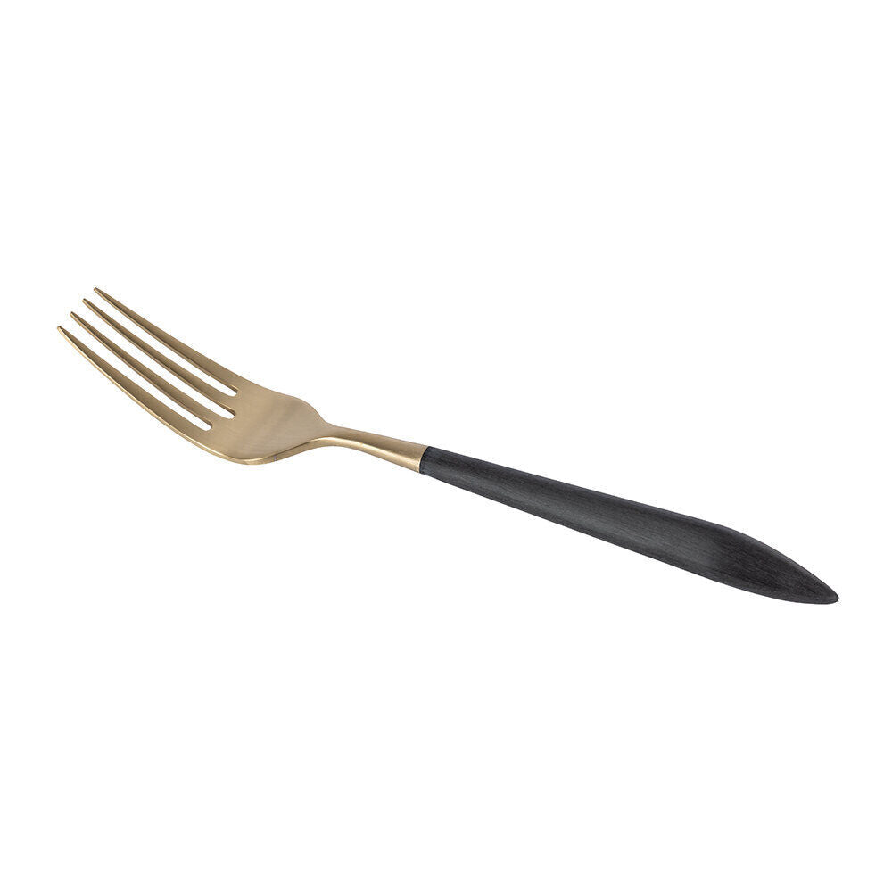 Welcome to the contemporary dining experience, it is the update your everyday dining style has been waiting for. With this Ares 24 piece cutlery set featuring soft curved lines and a timeless black and gold color scheme, your table will be the talk of the town. Add poetry to the table with this refined and elegant cutlery collection characterized by a slender and elongated shape and timeless design. Made of forged 18/10 stainless steel, 6 mm thick, with satin finish and resin handle, Ares pvd gold is ideal for an important and contemporary table.