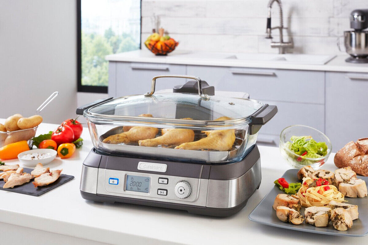 The Cuisinart Cookfresh Digital Glass Steamer cooks everything from whole fish and delicious curries to steamed desserts such as sticky date puddings in a snap. With a contemporary brushed satin stainless steel base and a generous 5L heat-resistant glass-lidded cooking and serving dish, it requires no pre-heating, achieving full steam temperature in less than 30 seconds and can be paused to add ingredients, stir or rest.