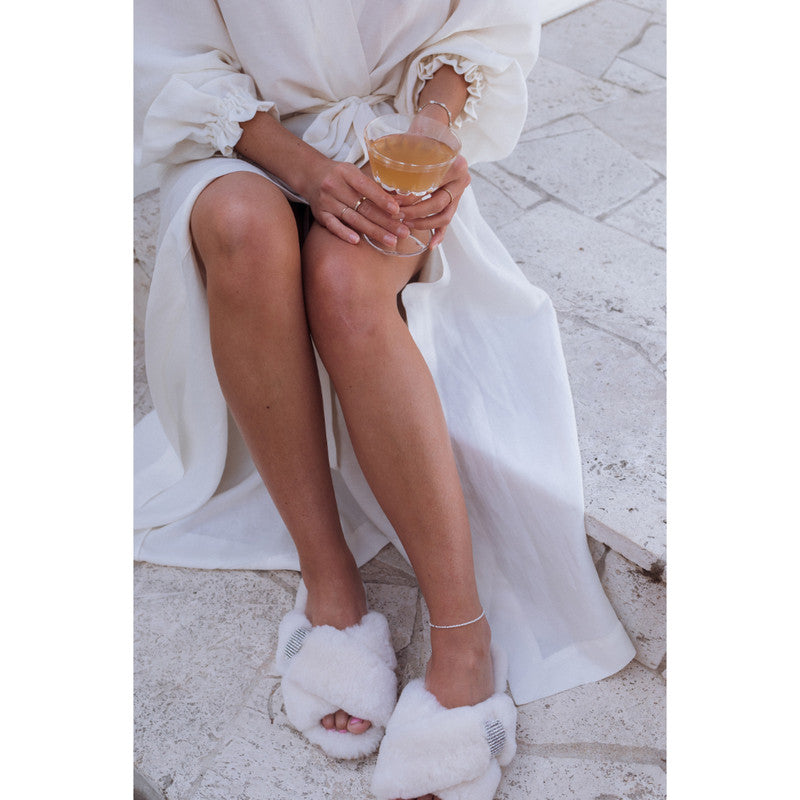 EMU Australia's Mayberry Crystal is part of an exciting new slipper concept, adding a touch of sparkle to our classic Mayberry slipper. The decorative crystal ring makes this the perfect gift for a bride-to-be or if you're looking to add some glam to your loungewear. Woolmark accredited Australian sheepskin offers ultimate comfort, while the crossover straps and open-toe design offers easy wear. The flexible rubber outsole features a wave design for traction and grip, suitable for indoors and out. Australian sheepskin features temperature regulating properties, keeping feet warm in the winter and cool in the summer, meaning you can wear these slippers 365 days of the year. The Mayberry slippers will feel firm at first. Over time, they will naturally give and mould to your feet for the perfect fit.