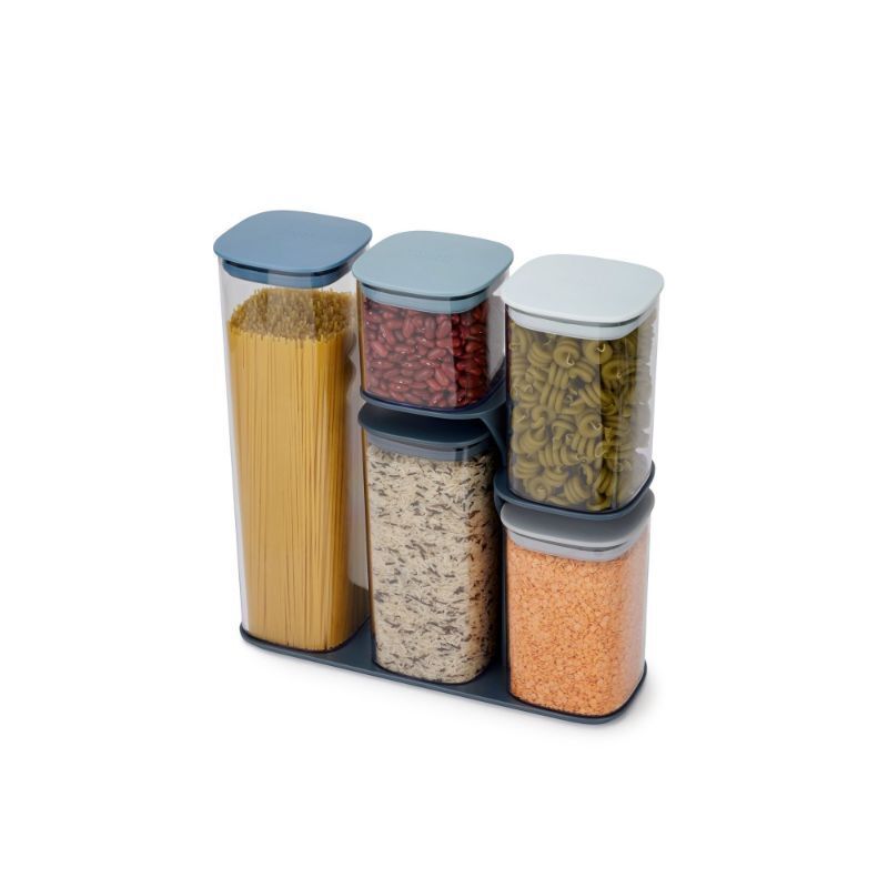 Protect your dry food with this 5-piece containers set!Be it for the kitchen, bathroom, or utility room, Joseph Joseph applies the same inventive thinking to everything they do. Their mission is to create desirable products that enhance everyday life and that stay true to their philosophy of creating Brilliantly Useful Design. Joseph Joseph's ability to blend innovative design, contemporary styling, and distinctive use of color is unique and has led them to create some truly iconic products.This smart storage container set features 5 food storage containers with a clever stand that allows easy access to any jar, regardless of its position.Clever stand allows any container to be accessed easily without removing others around it