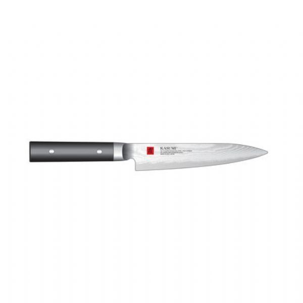 Kasumi knives are hand crafted in Seki, Japan, by the Sumikama family, a 27th generation family of knife makers. Kasumi Damascus Knives are made from 32 layers of stainless steel folded around a middle layer which acts asthe cutting edge. The middle cutting layer is made of V-Gold No. 10 high carbon stainless steel, a material specially developed for the sharpest and strongest knives.Kasumi knives are tempered and sharpened to create the 'sharpest kitchen knife out of the box' and the special technique for this tempering is a closely guarded secret. The edge on a Kasumi knife is beveled like a western style knife, however, the bevel is much larger than on a European or American brand.