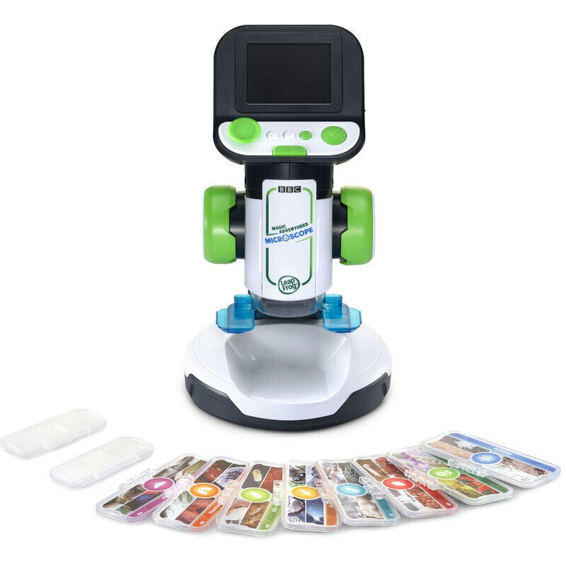 Explore tiny worlds full of huge discoveries with the Magic Adventures Microscope. Young biologists can zoom in on flowers, animals, food, minerals and more using eight double-sided smart slides that activate amazing BBC videos and images. Discover answers to curious questions like: How do leaves change colours? What do plant cells look like? What is sand made of anyway? Make your own discoveries by finding things around the house and getting a closer look using the reusable slides or large sample tray. You'll be amazed at what you can see with up to 200x magnification on this real microscope. See something incredible? Capture and save the on-screen images. Game time! Defend microorganisms from micro-invaders or put your skills to the test with the What's This? quiz.