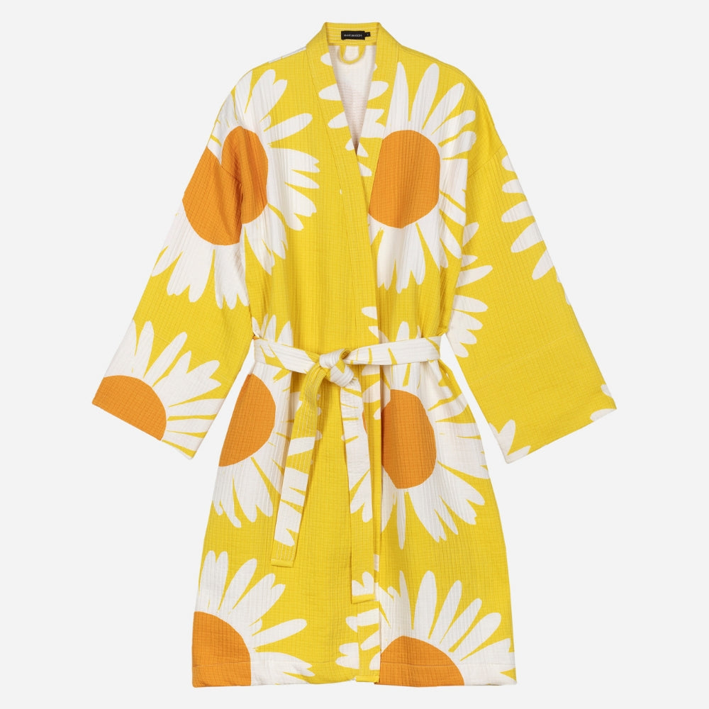 In the late 1950s, Maija Isola designed a wide series of Marimekko prints with motifs that expressed her deep love of nature. Among those prints was the joyous Auringonkukka (sunflower) pattern. The robe has long, loose sleeves that have wide turn-ups at the sleeve ends. The kimono-style beach robe has side seam pockets and a detachable belt.