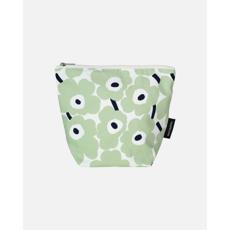 he Kaje cosmetic bag is made of cotton in the Mini Unikko pattern, which is printed in Helsinki. The bag closes with a zipper, and it has a recycled polyester lining and two pockets on the inside.
