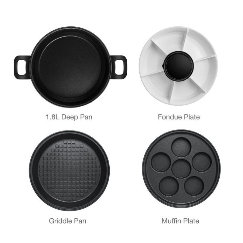 - Included accessories: Non-stick - Grill Pan, Non-stick - 1.8L Deep Pan, Non-stick - 6 space Muffin Plate, Fondue Tray