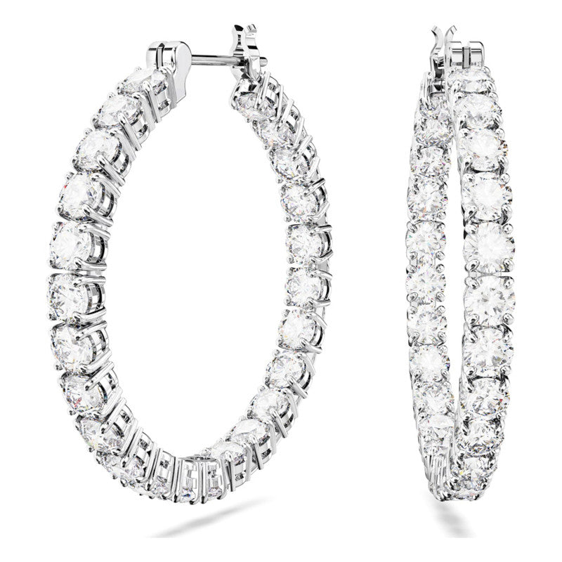 These perfectly formed Matrix hoop earrings are defined by the timeless look of clear round stones and Rhodium-plated metal. Reach for these hoops to deliver perfect circles of radiance to any outfit.