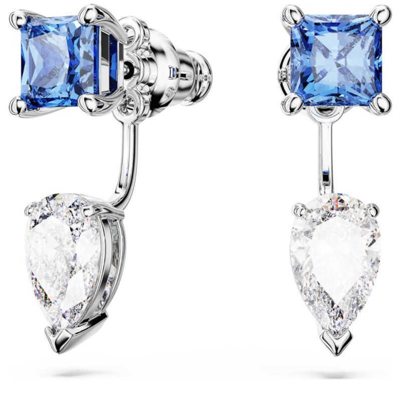 These attractive Mesmera earrings are a versatile and spellbinding choice. The pierced design is Rhodium-plated and features a pair of prong-set Swarovski Zirconia in pear and square cuts. Wear them as single blue studs or adjust the height of the detachable pear-cut drop to suit your style.