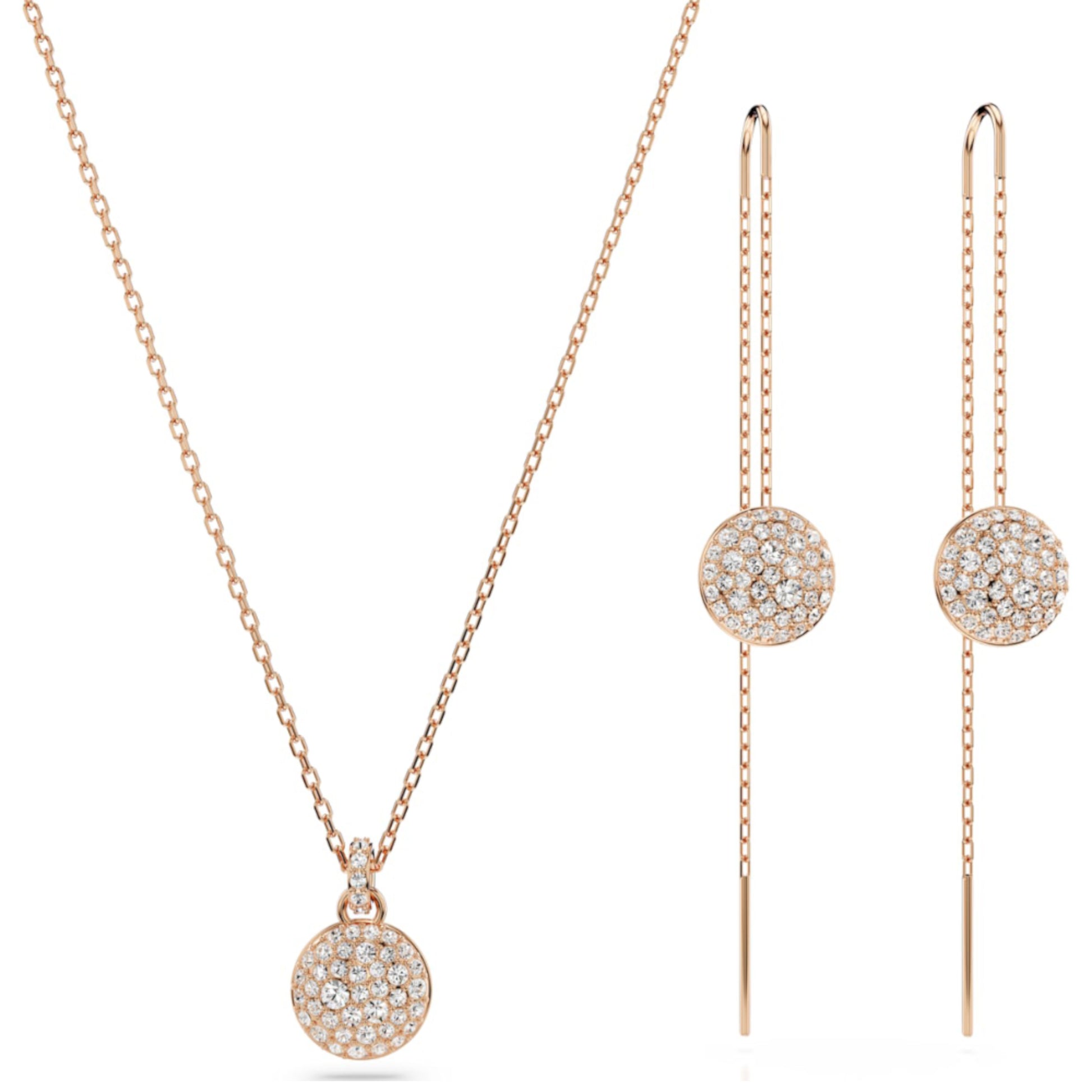 This rose gold-tone plated jewellery set combines starry inspiration with Swarovski savoir-faire. The radiant pendant is worn on a delicate chain with a lobster closure and features a domed meteor motif that is beautifully adorned with a snow pavé of clear round crystals in different sizes. The pierced earrings feature the same dazzling motif, set in a dangling double-chain design.