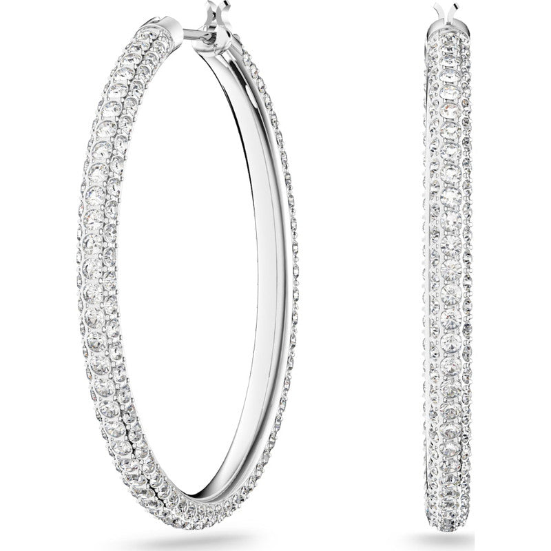 With this timeless pair of hoops, decorated with crystal pave for that special Swarovski sparkle. The delicate, rhodium-plated design is easy to wear with any outfit, from day to evening.