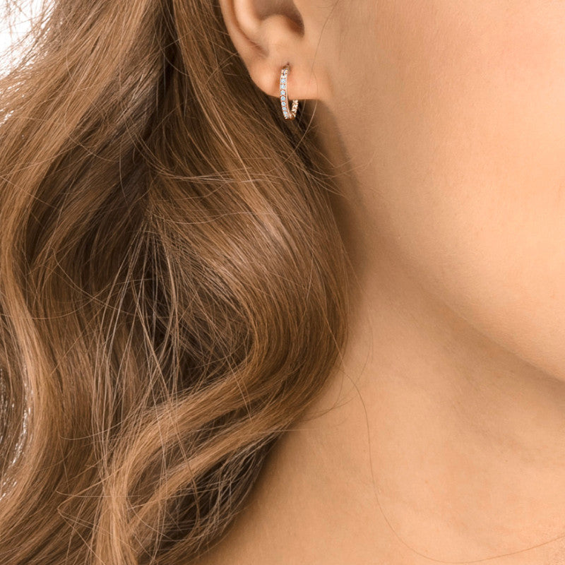 Dial up your fashion credentials with this versatile pair of hoop earrings in rose gold plating. They feature the protective talisman embellished in clear, blue, and black pavé. Hanging from classic clear pavé hoops, the eye motifs can be removed if desired. Certain to add a sense of cool and romantic glamour to even the most casual outfit.