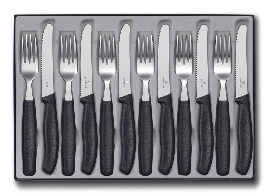 Knife and Fork Set for 6 people.Ever since it was established over 130 years ago, Victorinox's consistent focus has been on tradition, quality, and innovation. The philosophy of the family company is based on solid values that ensure continuous growth.Cutlery right after the chef is cuisine's closest confidant. Select carefully and it will tackle a myriad of courses and dishwasher cycles and still cut, slice and help you devour dishes with ease for years. The Swiss Classic Table Set delivers on every level: form, function, and durability. For entertaining or everyday dining, this is an essential, yet high-performance 12-piece knife and fork collection.